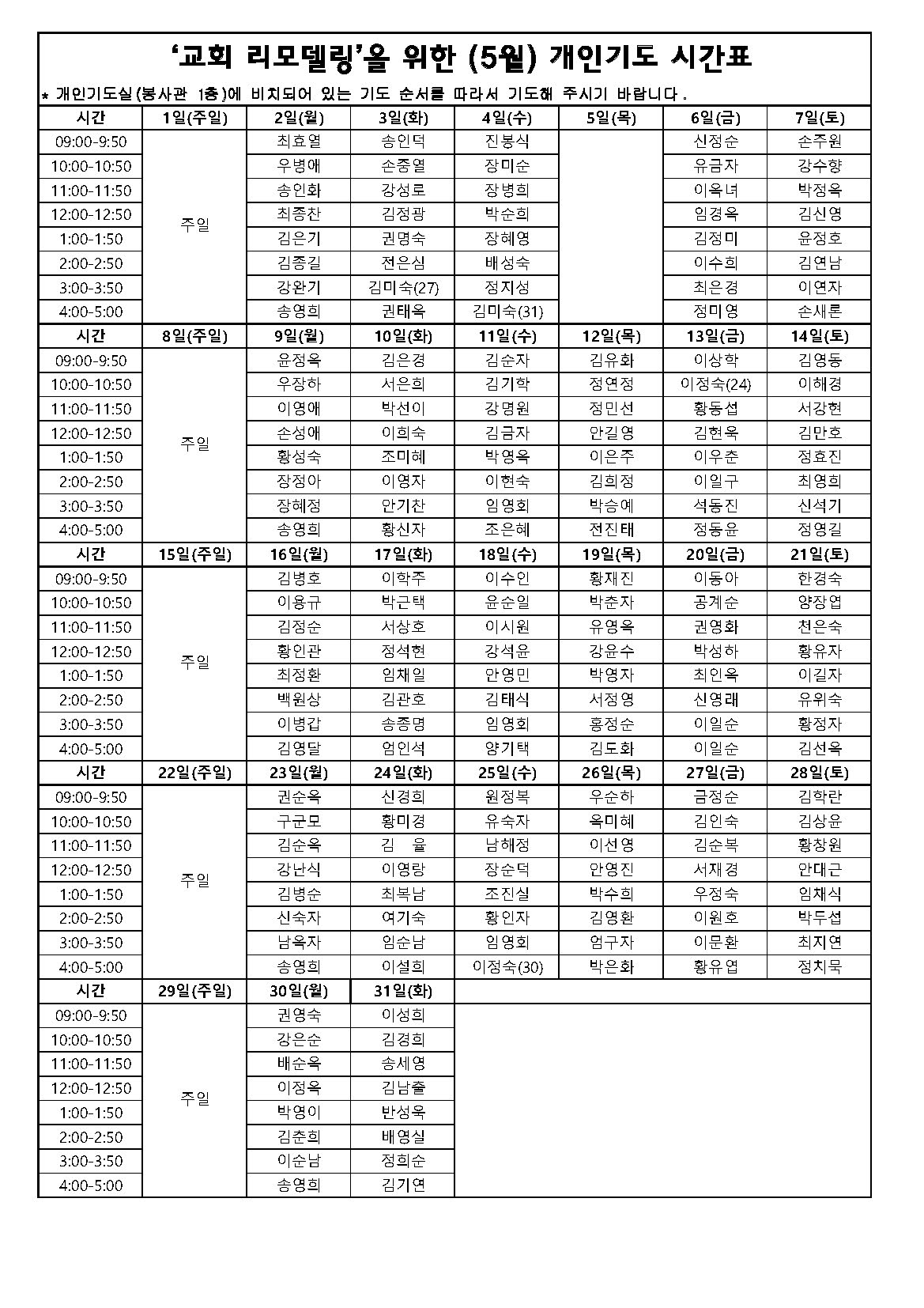 5월 리모델링 개인기도 시간표
