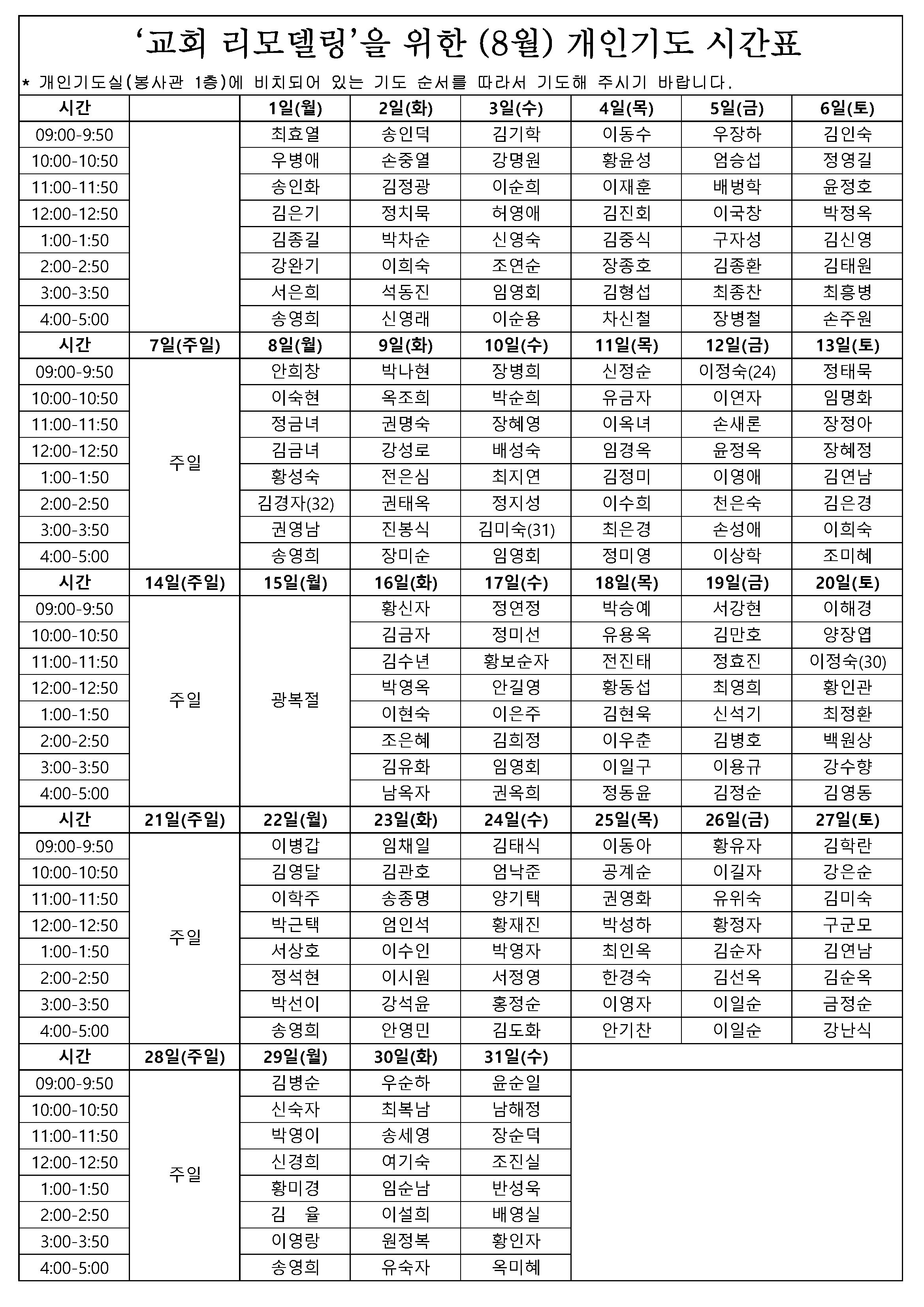 8월 리모델링 개인기도 시간표